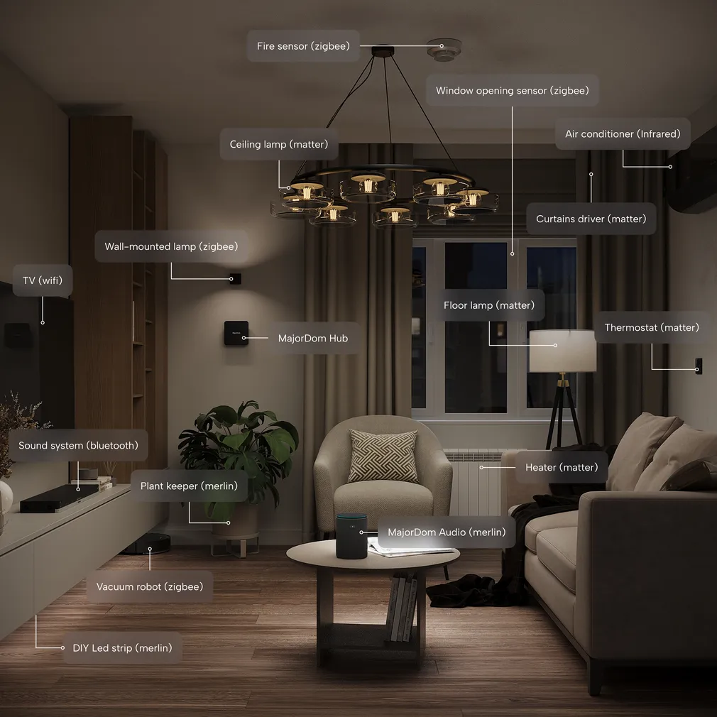 Of course, before setting up automation, you need devices in the house. The Zigbee Alliance, renamed the Connectivity Standards Alliance or CSA, is a coalition of various smart home companies that have decided to create a universal communication protocol for all home automation devices. They called this protocol Matter. And MajorDom is compatible with it. This means you can add any Matter compatible device to your MajorDom system. And that is not all.